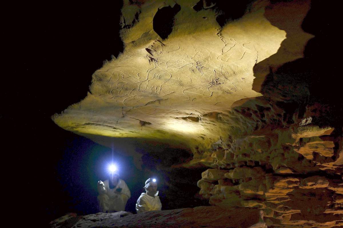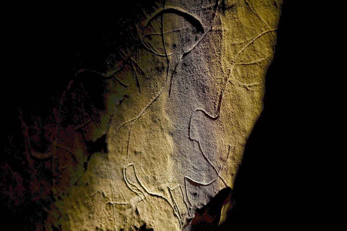 Scientists use flashlights to illuminate man-made engravings dating back to about 30,000 years, constituting the so-called panneau de la Decouverte (Discovery panel) located some 150 meters inside the Cussac cave. Photos were taken in Le Buisson-de-Cadouin, France, on Feb. 20.