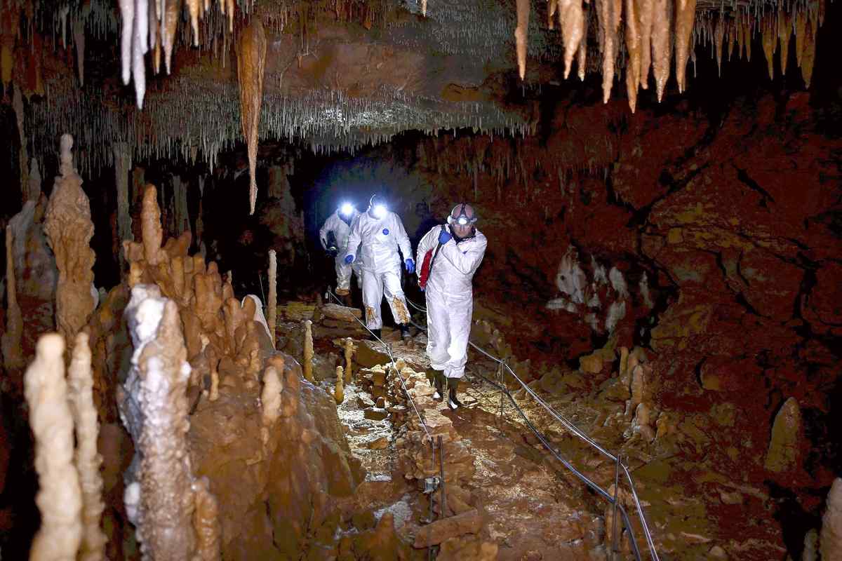 Lighting the way with headlamps, visitors cross vast chambers of stalactites and stalagmites, following the same narrow path as Marc Delluc, the late amateur speleologist who discovered the cave in September 2000.