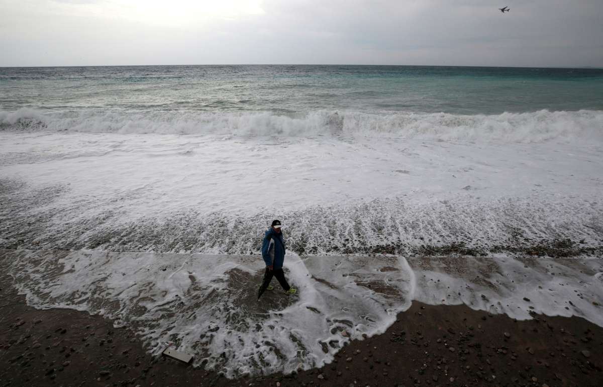 A man walks on the beach in Nice as storms and heavy rain lash through southern France, in October 2019.