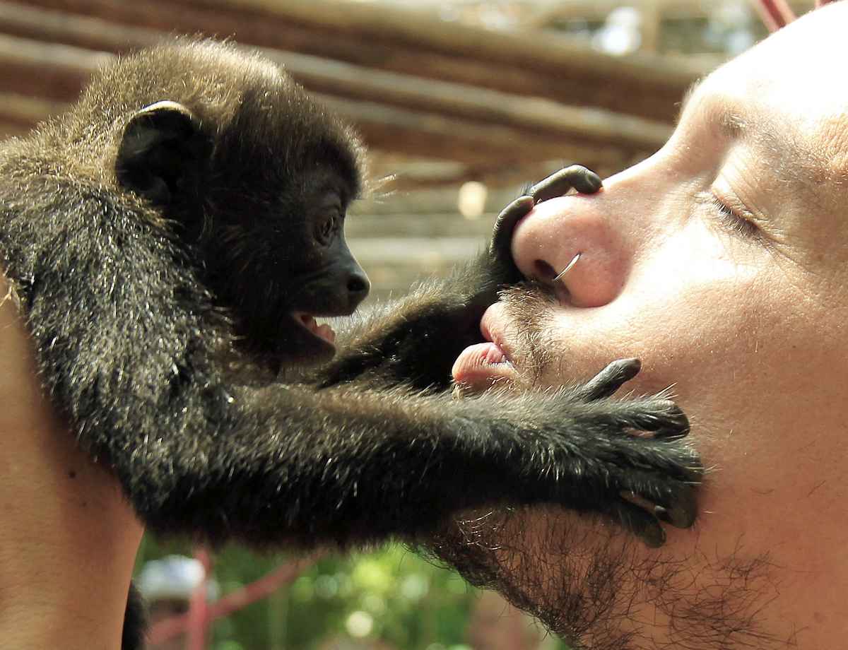 A tourist kisses a monkey at the Jaguar Animal Rescue Center in Puerto Viejo de Limon, Costa Rica, in August 2010.
