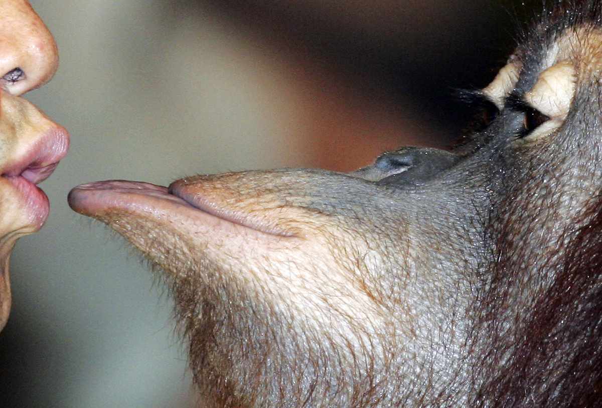 Six-year-old male orangutan “Allan” kisses his trainer while being given a piece of watermelon during a pause in the animal show at the Everland Zoo in Yongin, South Korea, in July 2005.