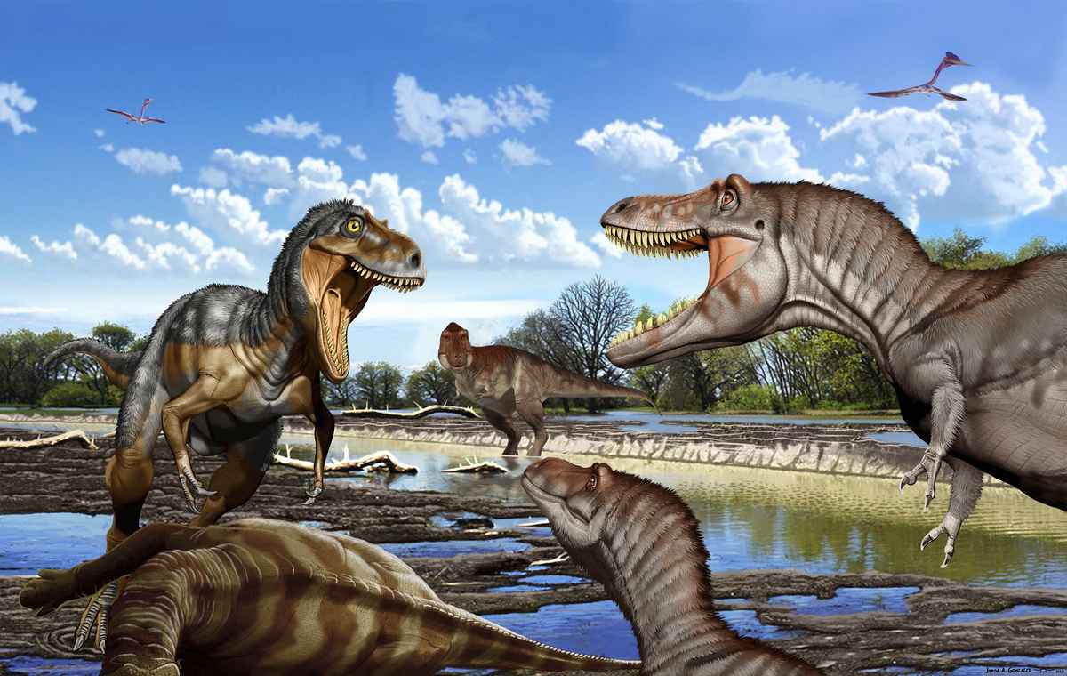 A late Cretaceous face-off between an adult Nanotyrannus, left, and two juvenile T. rex, with a sub-adult T. rex watching from a distance