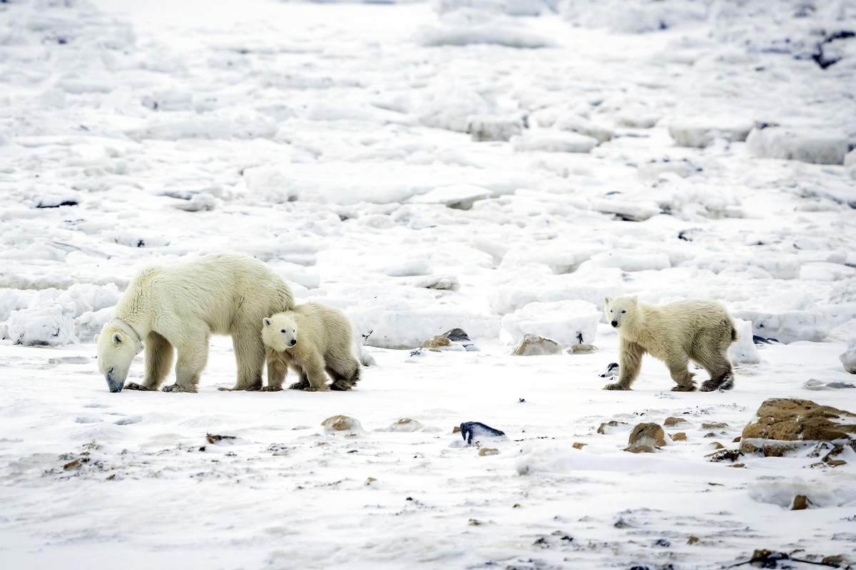 A wild female polar bear and her two cubs, one of whom she adopted, are seen at Hudson Bay in Churchill, Canada, on Nov. 11. This photo was released on Dec. 17.
