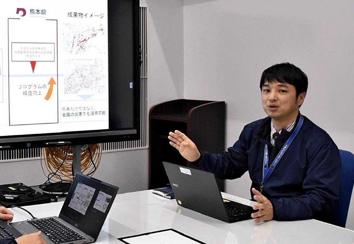 Taishi Wada, a Kumamoto prefectural government official, talks about data from the 2016 Kumamoto Earthquake in Kumamoto on April 3.