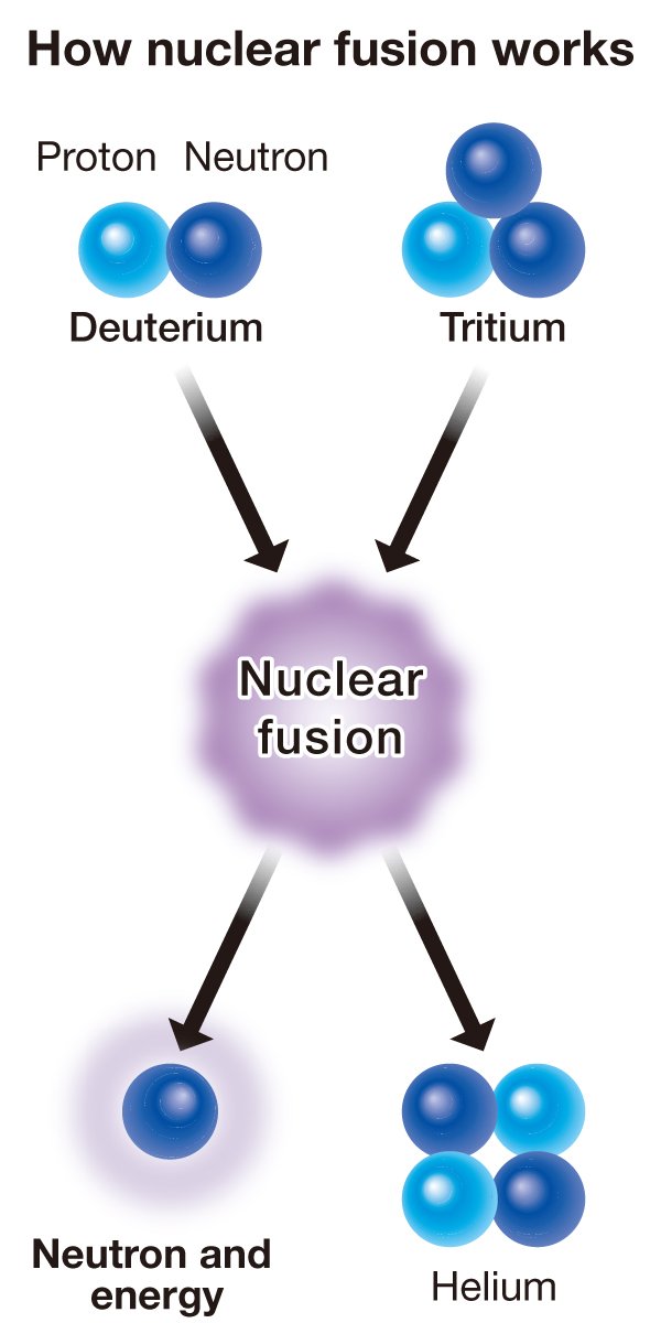 To generate power using fusion, nuclear fuels, such as deuterium and tritium, are heated to 100 million C or higher to cause the atoms to join together. Energy discharged from the reaction is converted into heat to generate electricity.