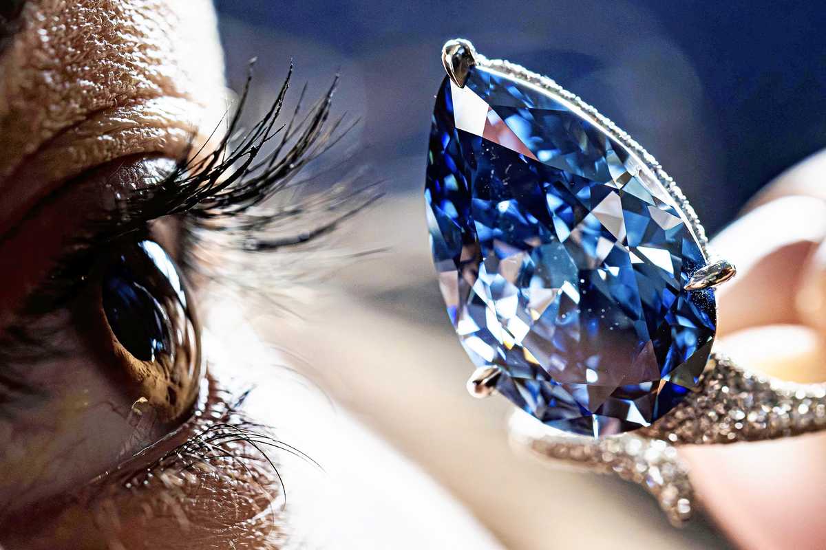 A staff member shows a vivid blue diamond, known as “The Mellon Blue,” during its presentation at Christie’s auction house in Geneva on Nov. 7.