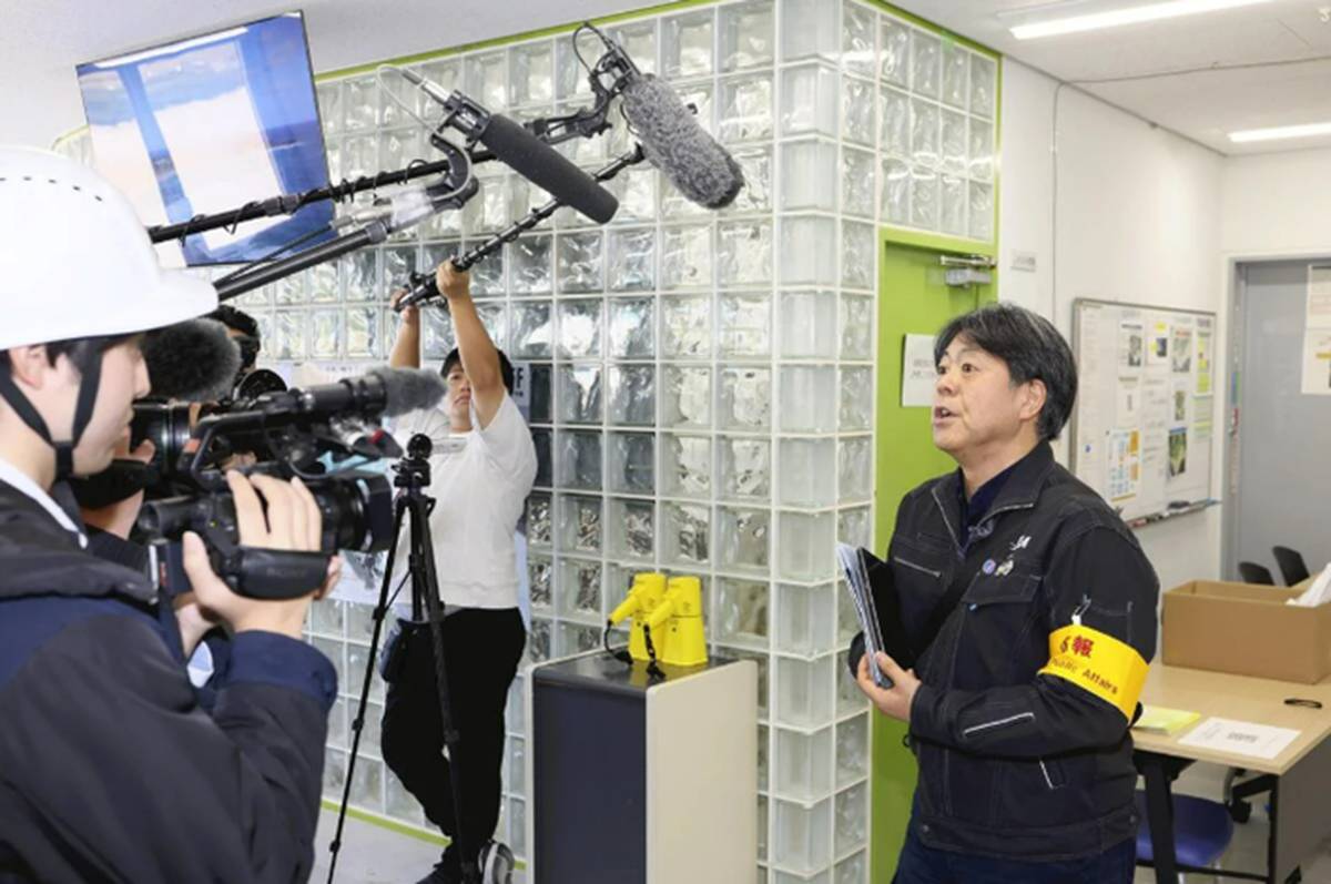A spokesperson for the Japan Aerospace Exploration Agency, right, speaks on Monday at the Tanegashima Space Center in Kagoshima Prefecture.