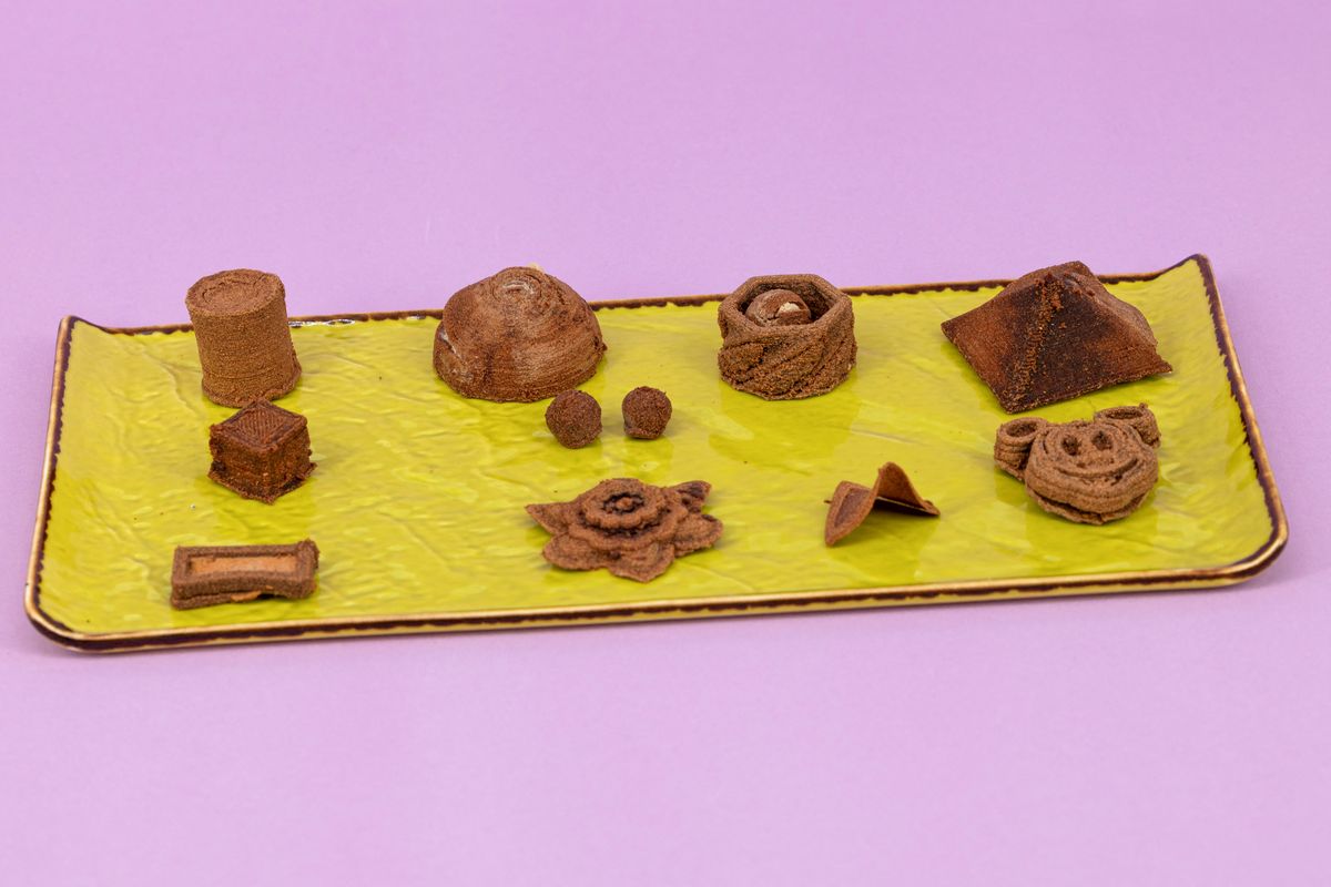 3D snack items are printed at the Elthub plant in Oricola, Italy, on Nov. 24.