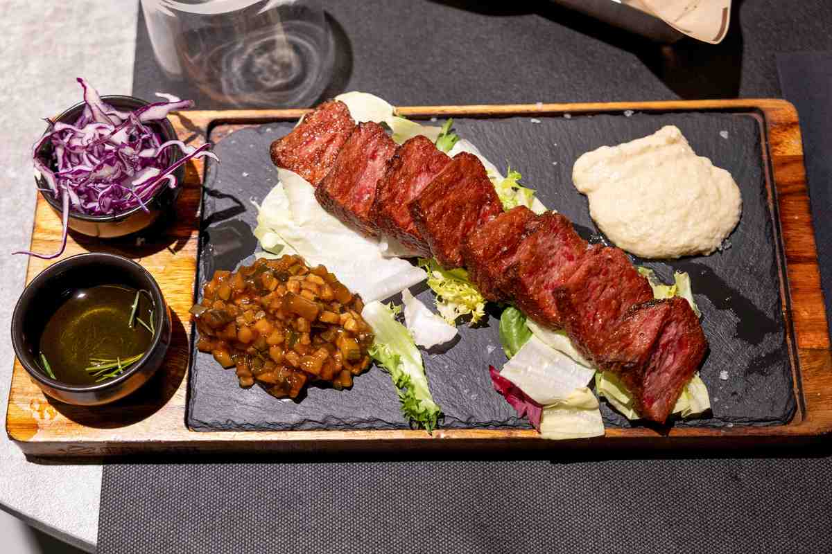 Plant-based 3D-printed sliced meat is seen at Impact Food restaurant in Rome on Dec. 1.
