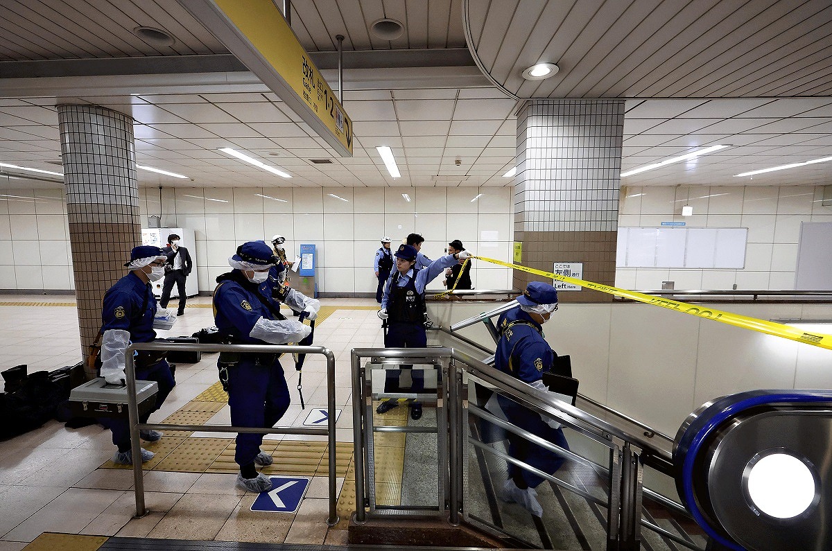 Police officials gather inside Todaimae Station on the Tokyo Metro Namboku Line in Bunkyo Ward, Tokyo, on Wednesday evening.