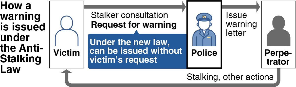 The law was revised in December 2016 to enable the issuance of a restraining order even without a warning being issued, so that stalkers can be prevented from approaching their victims. However, observers have pointed out that a restraining order is a heavier administrative punishment than a warning, so considerable time is required to collect sufficient evidence and conduct all required procedures.