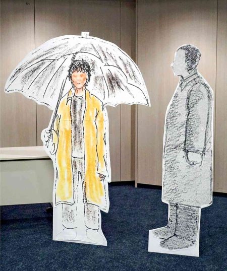 Life-size panels of the suspicious man witnessed near the scene of the 1996 murder case are seen in Chiyoda Ward, Tokyo.