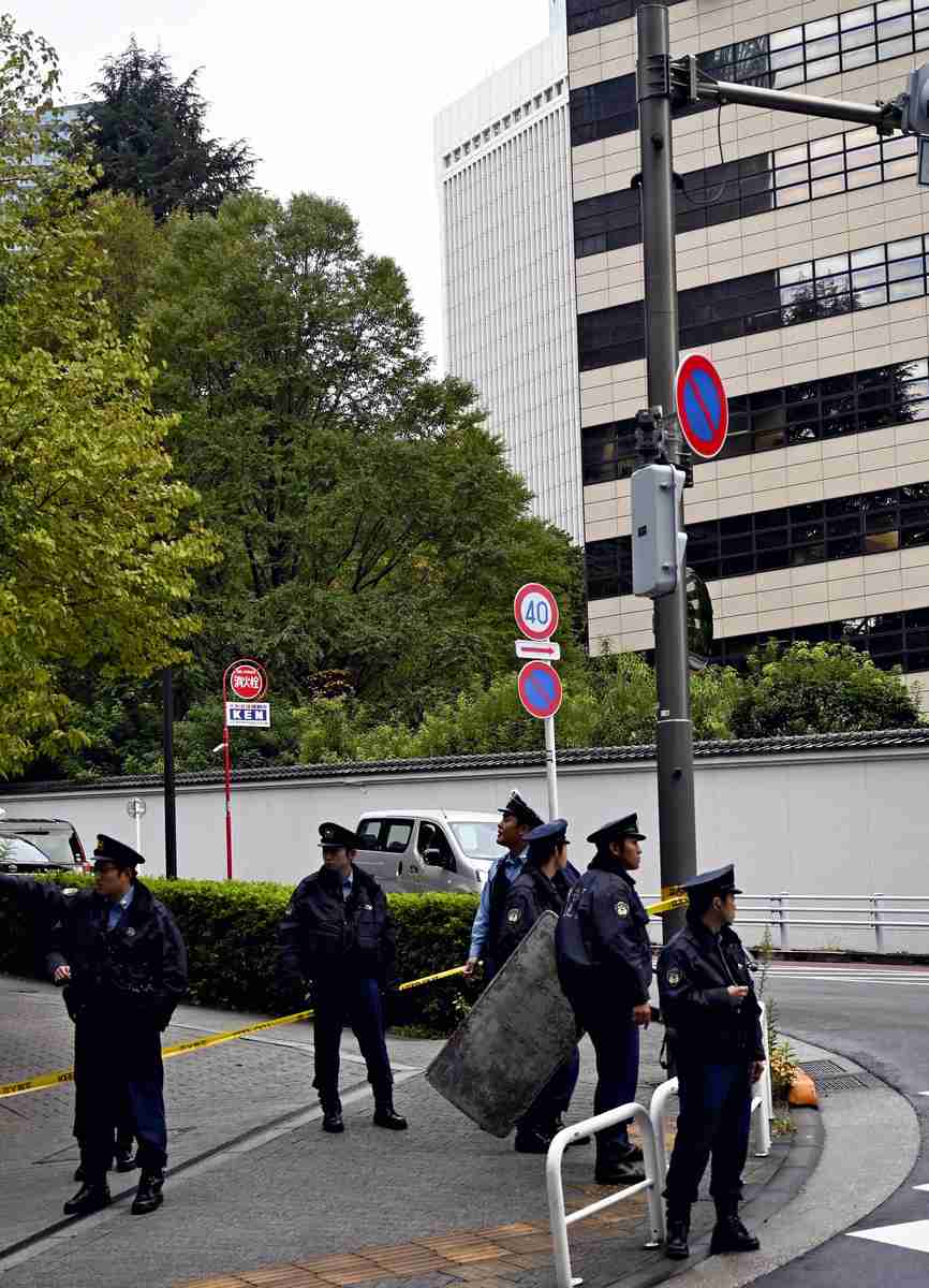 Police officers stand on guard near the U.S. Embassy in Tokyo on Friday.