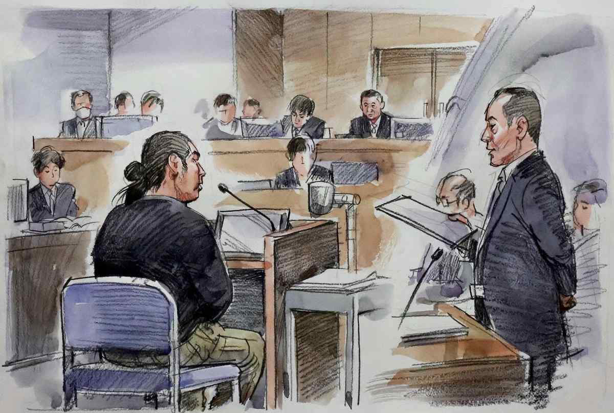 At about 3:45 p.m., Yamagami, attired in a black sweatshirt and beige trousers, was prompted by presiding Judge Shinichi Tanaka to approach the witness stand. He slowly moved to the stand, bowed to the judge, and then sat down.