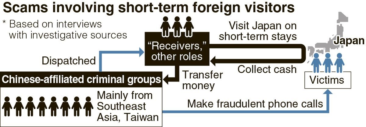 Within Japan, recruiters exist who receive compensation from Chinese-linked organizations to send “callers” — people who make phone calls to deceive victims — to overseas scam hubs. Such hubs often control workers through violence, raising concern about human trafficking.