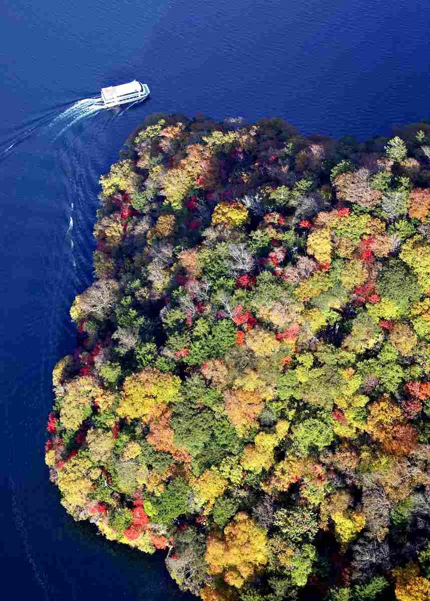 Autumn leaves changing to seasonal red and yellow colors at Lake Chuzenji in Nikko, Tochigi Prefecture, were seen from a helicopter on Sunday. Tourists were delighted by the sight of the color changes seen on maple and mountain ash amongst other trees and bushes in the area. According to the Nikko Natural Science Museum, the first autumn leaves this year were seen in late September, about a week later than usual. As colder weather arrived in October, the speed of the color change returned to normal with the leaves looking brighter than last year. The peak of autumn leaves along the Irohazaka winding mountain road in the area is expected to come down toward the city area in early November. Tourist numbers have increased since last year thanks to the recently launched government program for boosting domestic tourism.