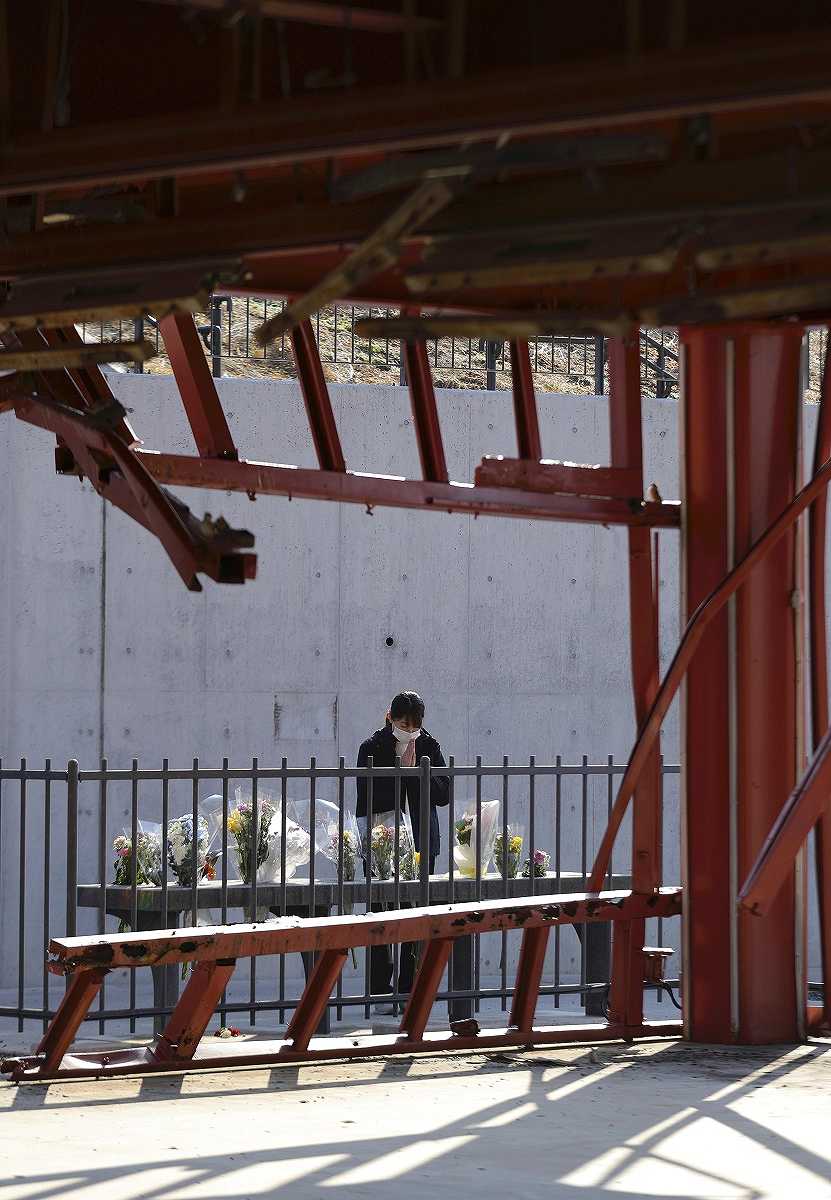 A woman prays at a tsunami-ravaged building formerly used as the disaster prevention countermeasures office in Minami-Sanriku, Miyagi Prefecture, on Tuesday.