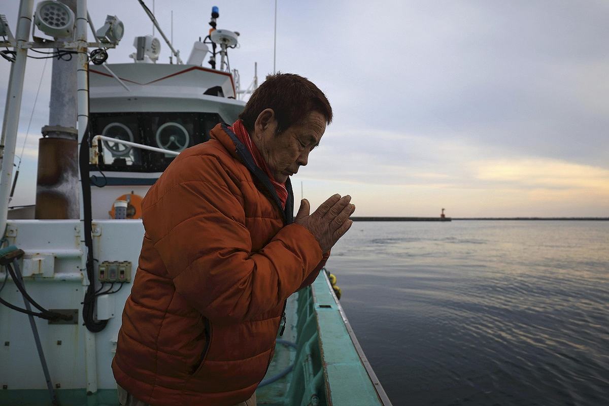 A man prays for his brother, who was killed by the tsunami, on a ship off Soma, Fukushima Prefecture, on Tuesday.