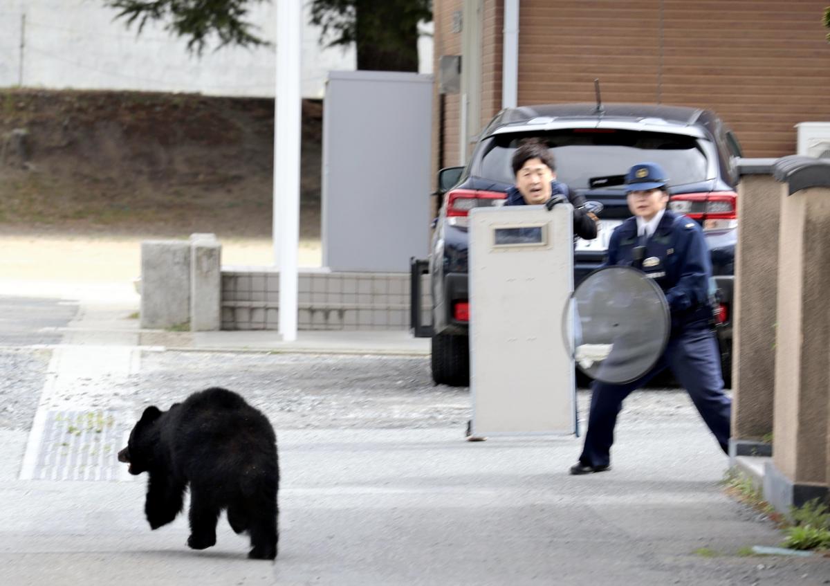 A bear runs in a street while police officers keep a watchful eye in Kamaishi, Iwate Prefecture, on Thursday.
