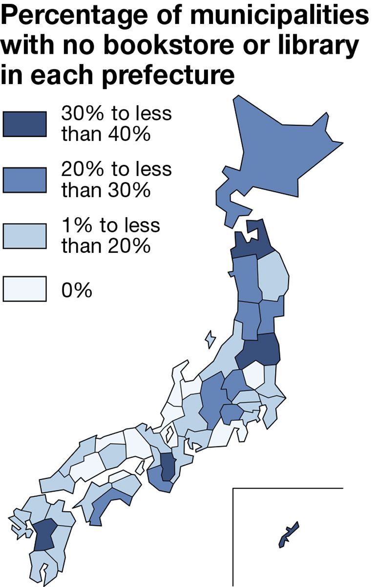 Municipalities with no library or bookstore, like Yuzawa, now account for over 30% of all municipalities in five prefectures: Aomori, Fukushima, Nara, Kumamoto and Okinawa.