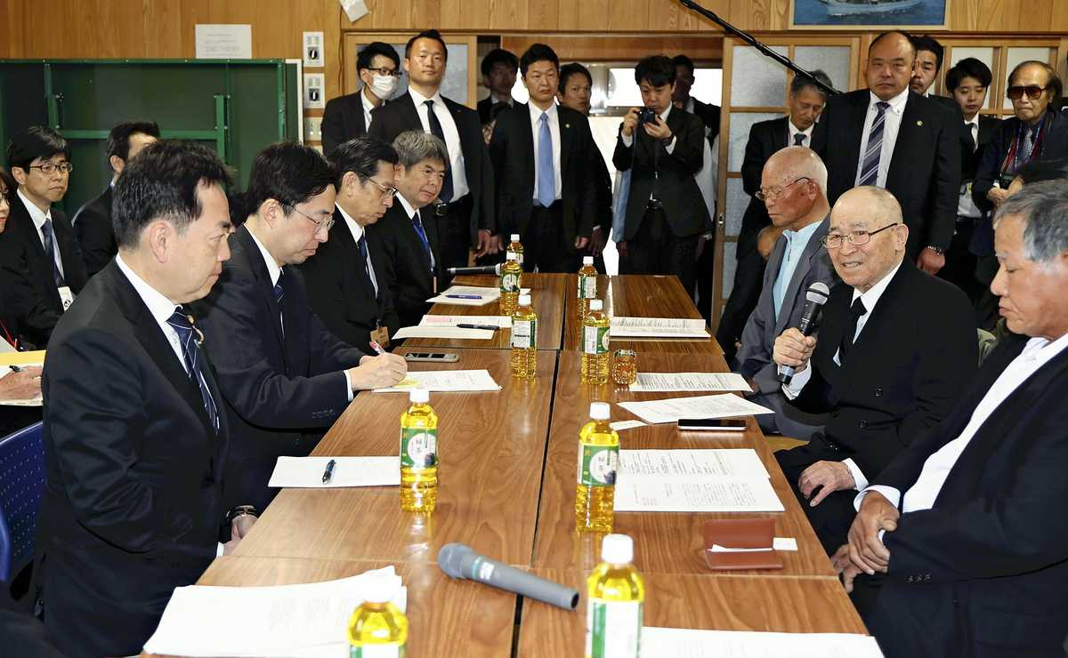 Shigemitsu Matsuzaki, right, speaks at a meeting between Environment Minister Keiichiro Asao, far left, and Minamata disease sufferers groups in Minamata, Kumamoto Prefecture, on Thursday.