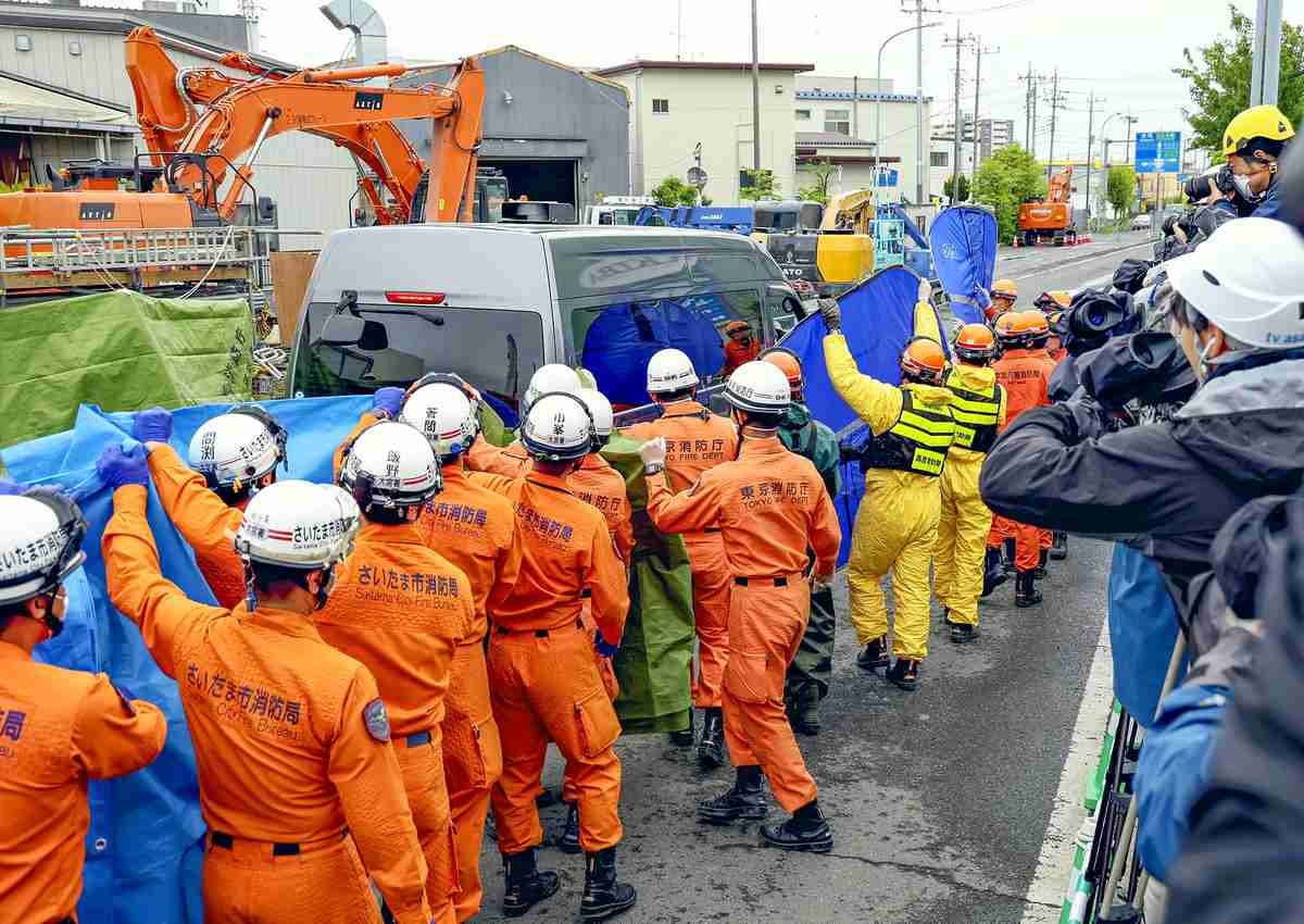Firefighters and others in protective gear and carrying oxygen tanks entered the 4.75-meter-diameter sewer pipe at around 4:20 a.m. Friday. The body was removed from the driver’s cab and transported to the Soka Police Station shortly after 8 a.m.
