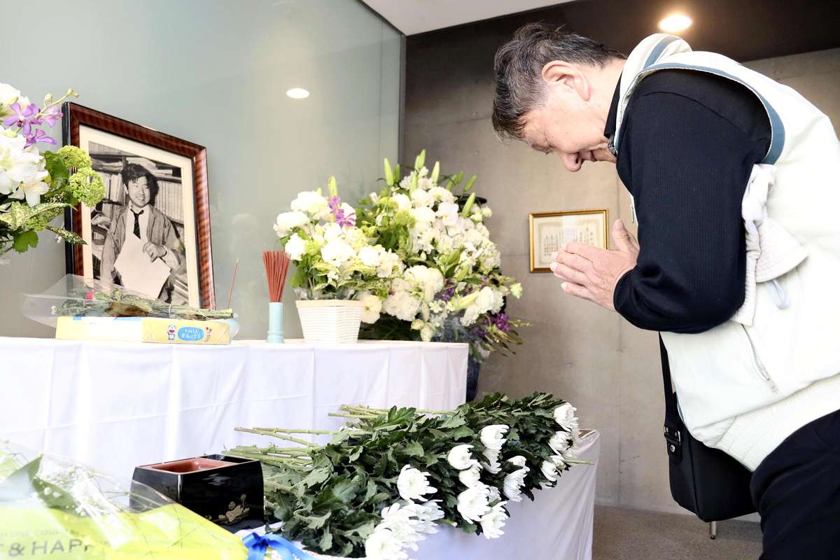 A man prays in front of a photo of Tomohiro Kojiri in Nishinomiya, Hyogo Prefecture, on Saturday.
