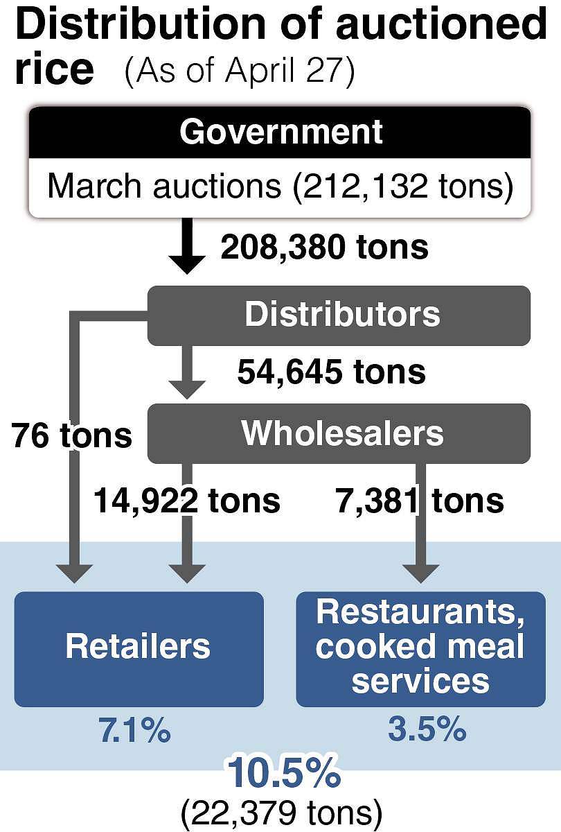 About 210,000 tons of stockpiled rice was auctioned in March. However, just 10.5%, or 22,379 tons, had been delivered to supermarkets and other retailers, restaurants and cooked meal services, the Agriculture, Forestry and Fisheries Ministry said Tuesday.