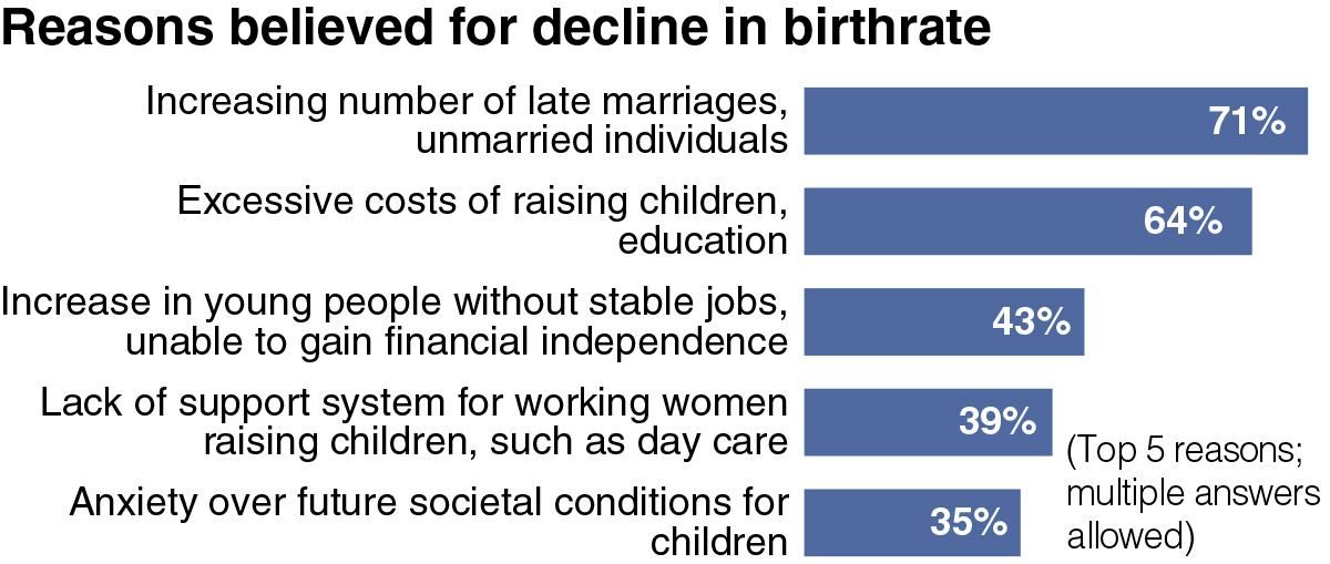 In a multiple-response question about the perceived causes of the low birthrate, 71% of respondents identified “later marriages” and the “declining rate of marriage” as the main reasons for the decline in birthrate, up from 69% in the 2023 survey.