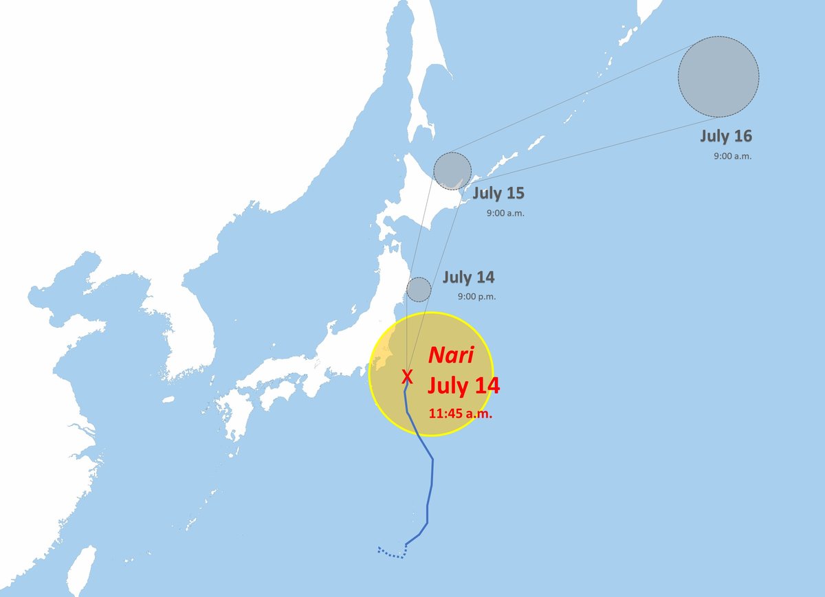 Typhoon Nari is forecast to be traveling north at 50 kph about 70 kilometers southeast of Miyako, Iwate Prefecture, by 9 p.m. Monday. At that time, the agency forecasts that its central pressure will be 985 hectopascals and the maximum instantaneous wind speed will be 40 meters per second (144 kph).