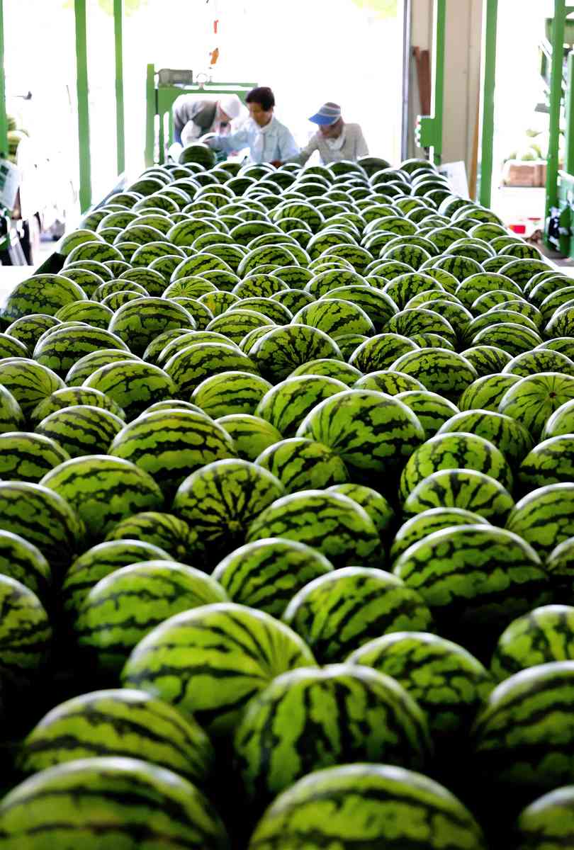 Obanazawa watermelons are sorted at a facility before being shipped early Thursday morning in Oishida, Yamagata Prefecture — one of the nation’s leading producers of the summer delicacy. The Obanazawa brand is cultivated in Obanazawa, Murayama and Oishida in the prefecture, where there is a large temperature difference between day and night. Already known for its high sugar content, the fruit is said to be even sweeter this year due to the lack of rain. About 12,350 tons are expected to be shipped across Japan by early September.