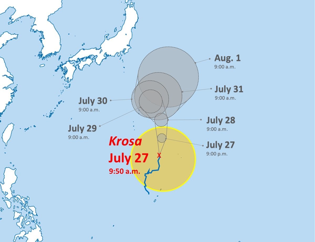 Krosa is expected to continue north and move closer to the Ogasawara Islands tomorrow with an anticipated increase of speed to 25 kph by 9 a.m. Monday.