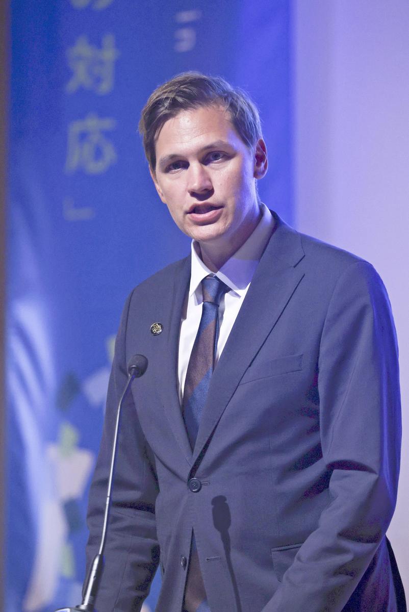 Jorgen Watne Frydnes, the chair of the Norwegian Nobel Committee, gives a speech at Sophia University in Chiyoda Ward, Tokyo, on Sunday.