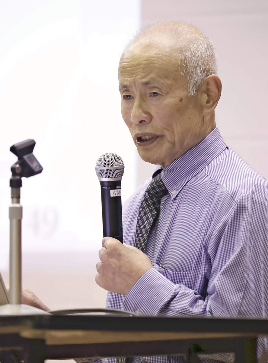Hidankyo’s Toshiyuki Mimaki speaks about his experiences as an atomic bomb survivor, in Sanyo-Onoda, Yamaguchi Prefecture, in October 2024.