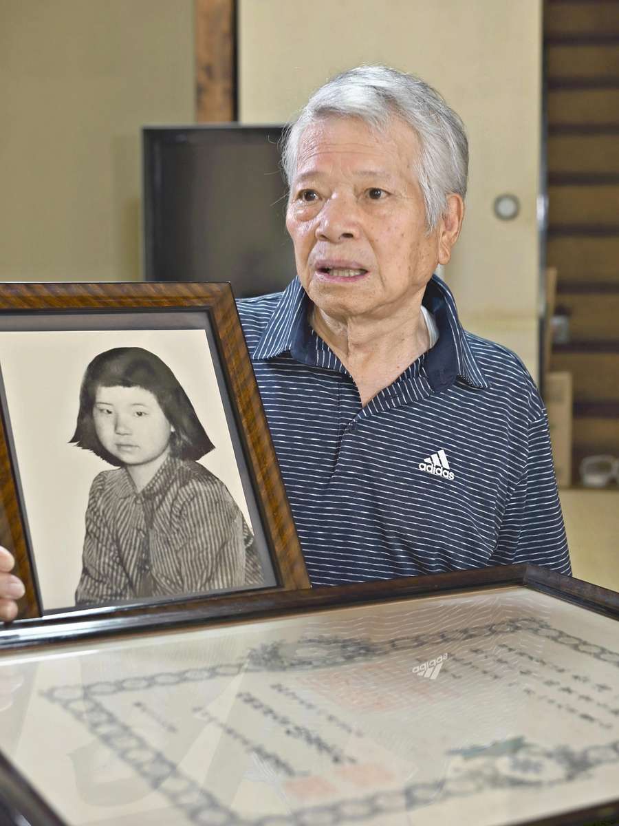 Yoshiaki Matsuura holds a photo of his sister Haruko in Otsu as he speaks about a mock atomic bomb.