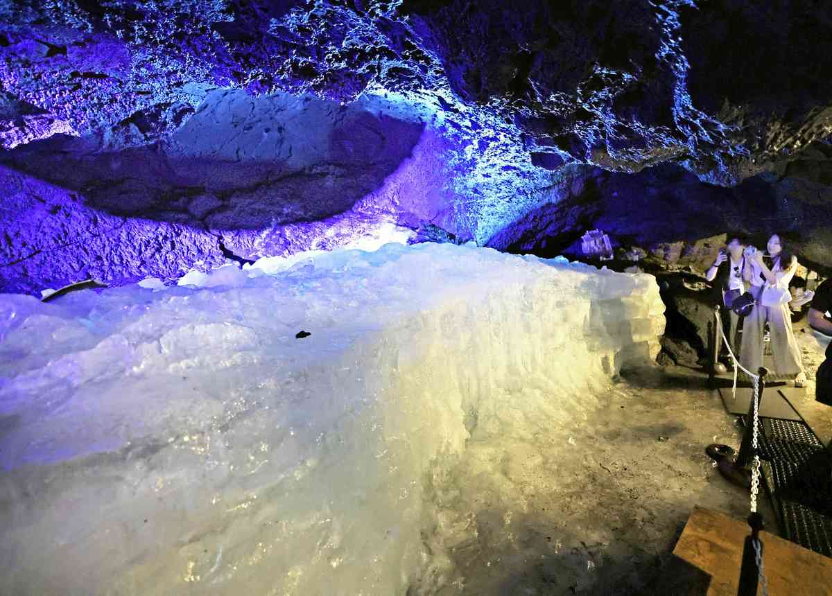 KOFU — Tourists seeking to cool down in the scorching heat are flocking to the Narusawa Hyoketsu Ice Cave in Yamanashi Prefecture, located at the foot of Mt. Fuji.