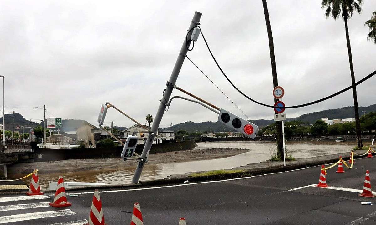 A traffic light is seen fallen due to a riverbank collapse in Aira, Kagoshima Prefecture, on Friday.