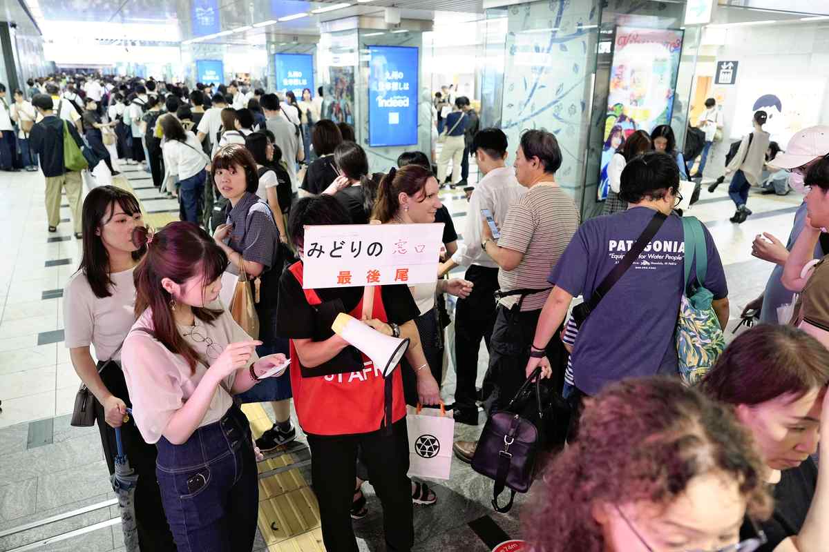 JR Hakata Station is crowded with passengers on Monday due to the cancellation of Shinkansen services.