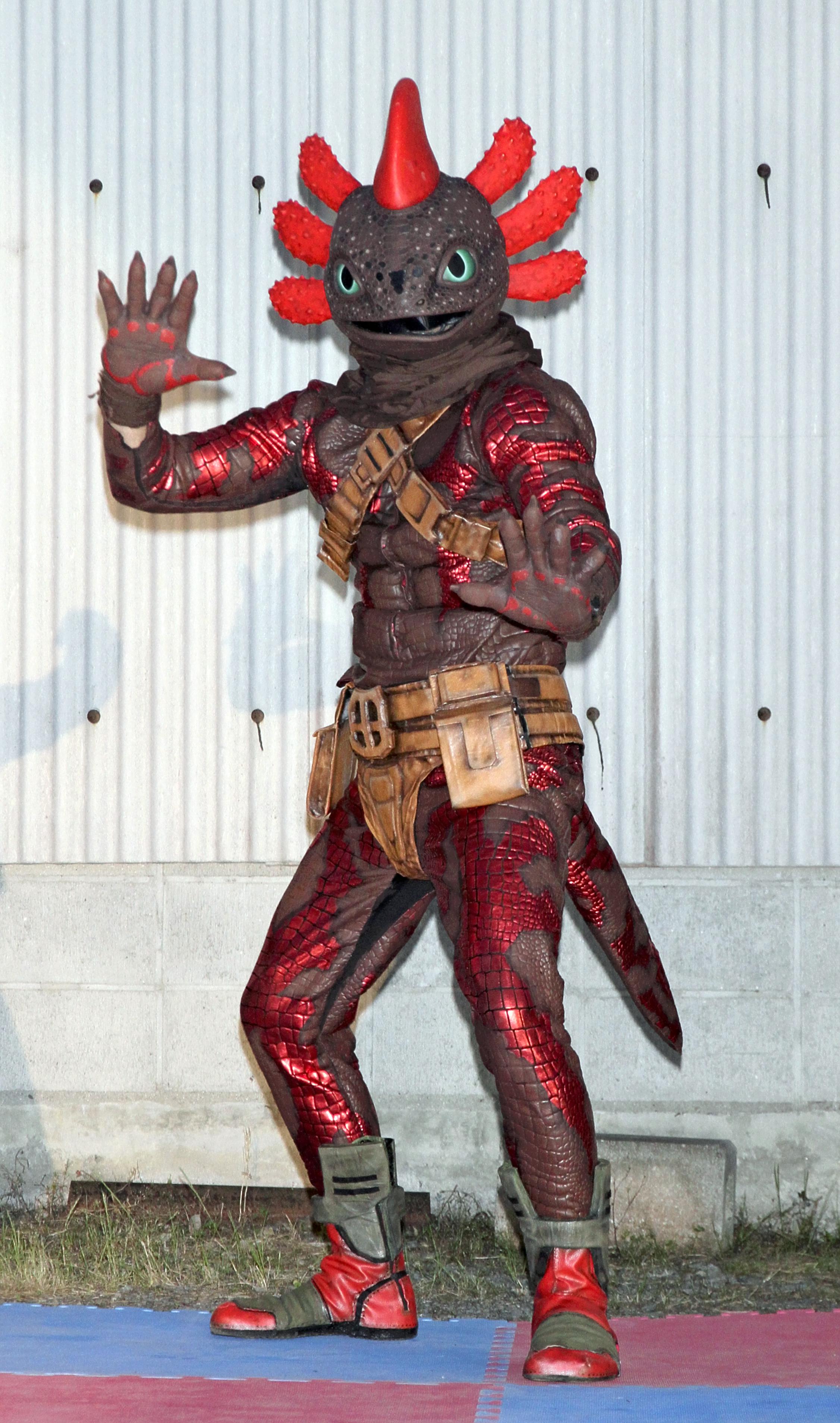 The hero, whose name translates as “Pristine Stream King Salamander,” is an intimidating figure with a wide mouth, piercing eyes and masculine body with a red pattern. According to the man who created it, the hero is an “evolutionary form of a normal giant salamander.” It is a hero of justice, who fights “evil” herons and cormorants.