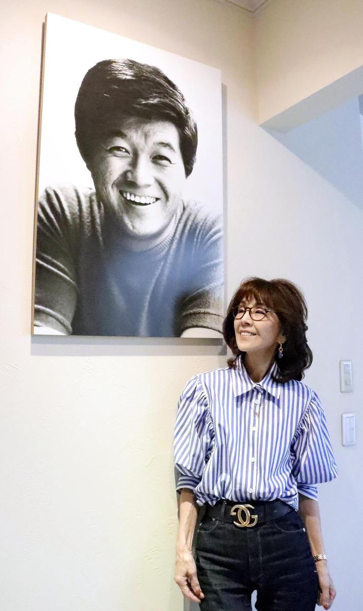 Yukiko Kashiwagi stands beside a photograph of her late husband Kyu Sakamoto in Tokyo in July.