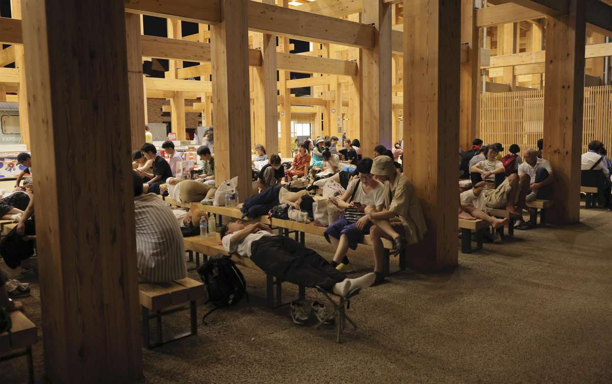 People stranded at the Osaka-Kansai Expo site rest under the Grand Ring wooden structure at about 12:30 a.m. Thursday
