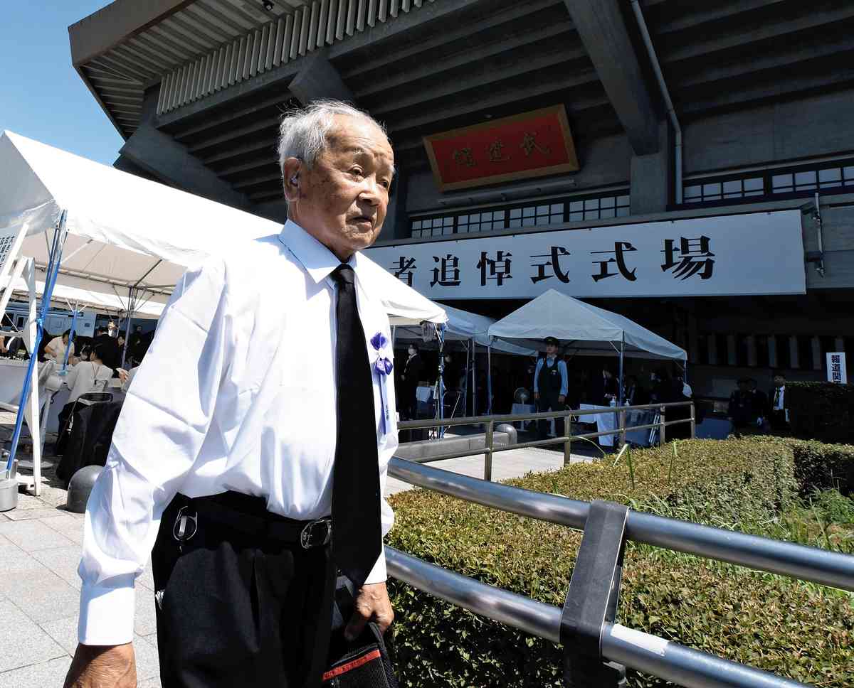 Mitsuaki Yoshino heads to the Nippon Budokan Hall for the 80th Memorial Ceremony for the War Dead in Chiyoda Ward, Tokyo, on Friday.