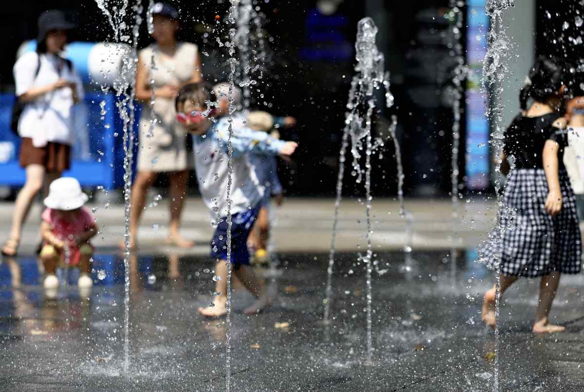 Children enjoy playing in the water at Solamachi Square in Sumida Ward, Tokyo, on Tuesday, when a high-pressure system sent temperatures rising from the early morning. It was the 9th consecutive day for the temperature to exceed 35 C in central Tokyo, with the mercury reaching 35.1 C at 1:40 p.m., tying the record for the longest streak set in 2022. A 4-year-old boy from Koto Ward with his parents enjoyed the cool water spraying from the ground, saying, “It’s cold and feels awesome.”