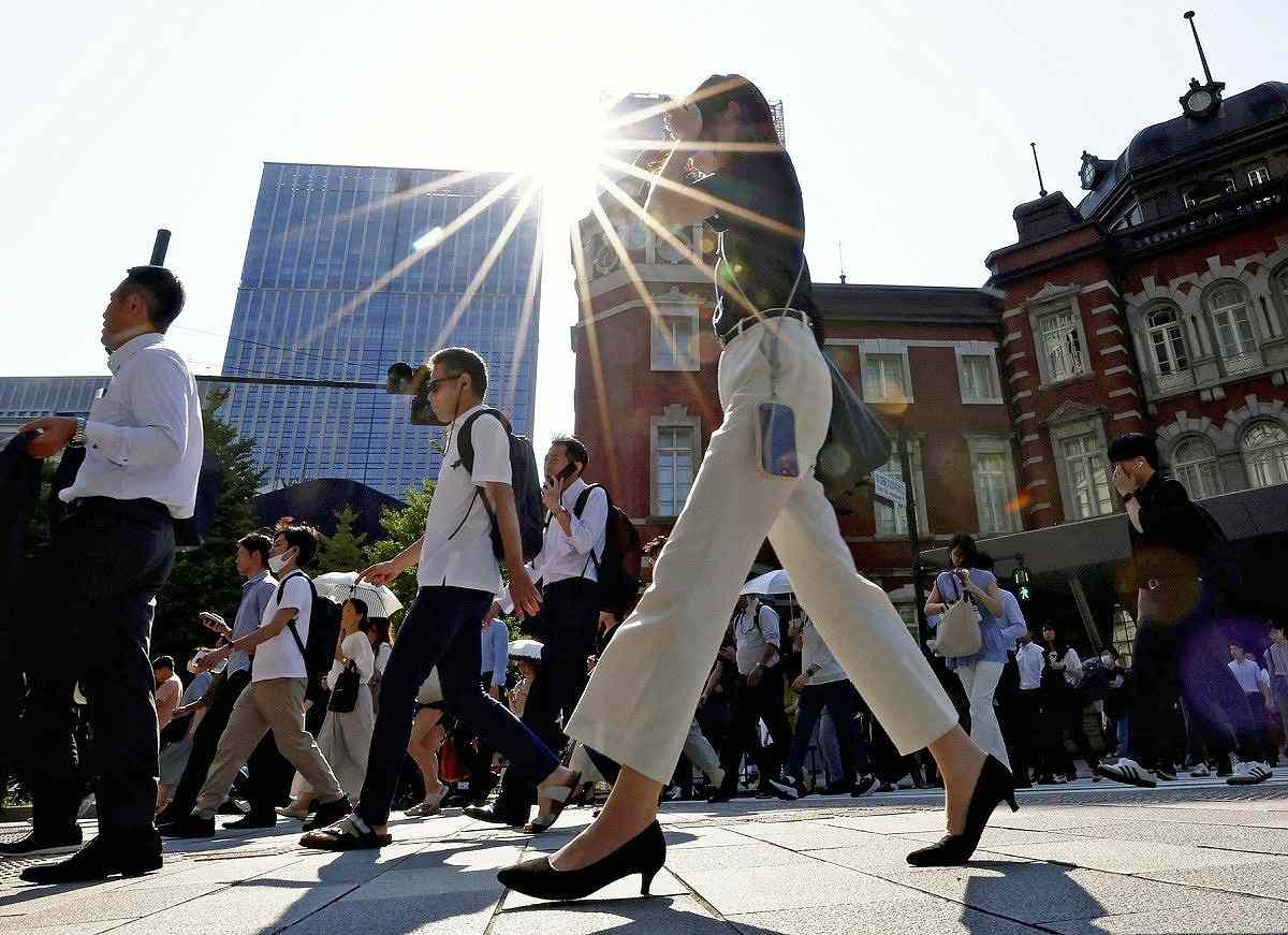 People heading to work in the intense heat in front of JR Tokyo Station at 8:07 a.m. on Wednesday.