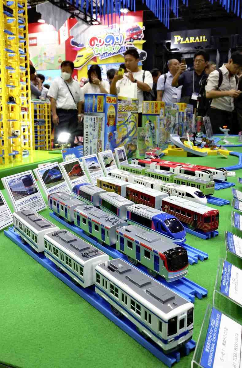 Plarail series trains are seen at Tomy Co.’s booth at the International Tokyo Toy Show in Koto Ward, Tokyo, on Thursday.