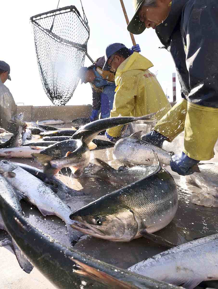 Fishermen land autumn salmon in Taiki, Hokkaido, on Thursday as the season kicks off across the prefecture. About 6.3 tons of salmon were landed on the day in the port town of Taiki by five fishing boats. Workers swiftly separated the males from the females.