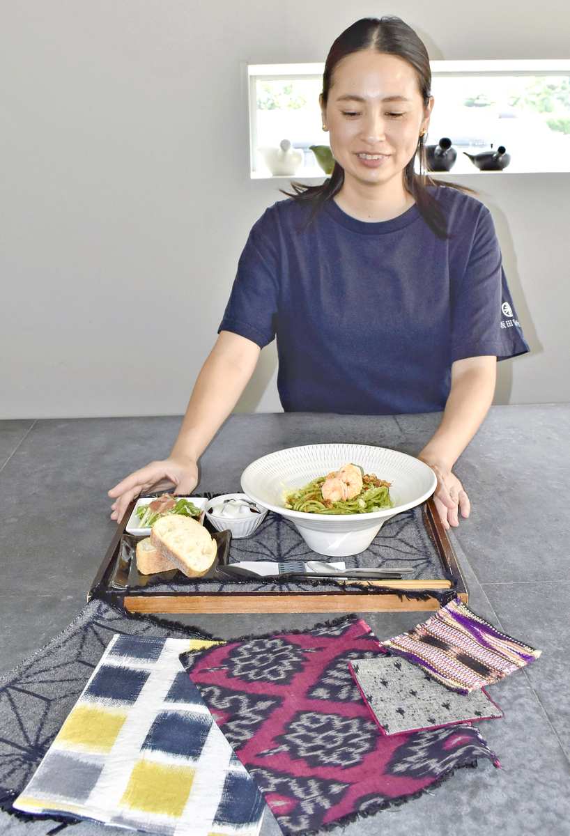 A sakata cafe staff member serves a dish on a Kurume kasuri placemat in Hirokawa, Fukuoka Prefecture.