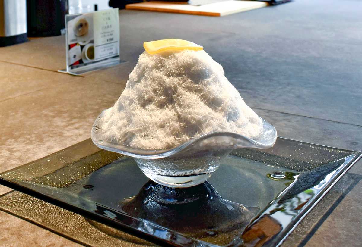 The cafe’s shaved ice, for example, is made by freezing butterfly pea herb tea and shaving it to resemble threads. When lemon syrup is poured over the blue-hued ice, it turns purple, and the change of colors is reminiscent of indigo dyeing during the Kurume kasuri manufacturing process.