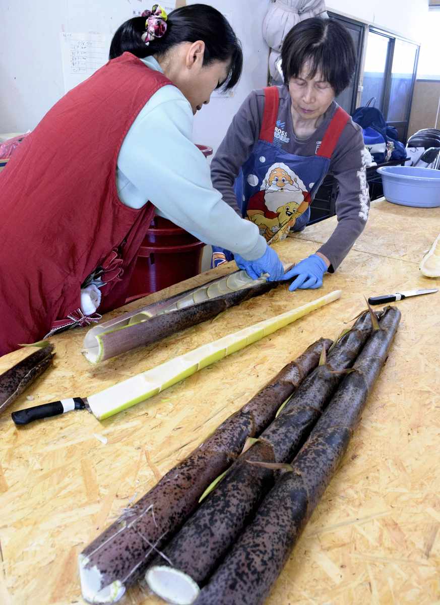 Locals process young bamboo shoots into menma in Himi, Toyama Prefecture.