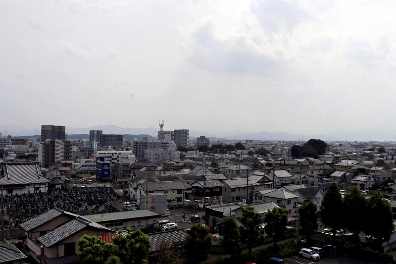 A view of the Honjo cityscape, with the Chichibu mountains in the distance, as seen from the city office in Honjo, Saitama Prefecture